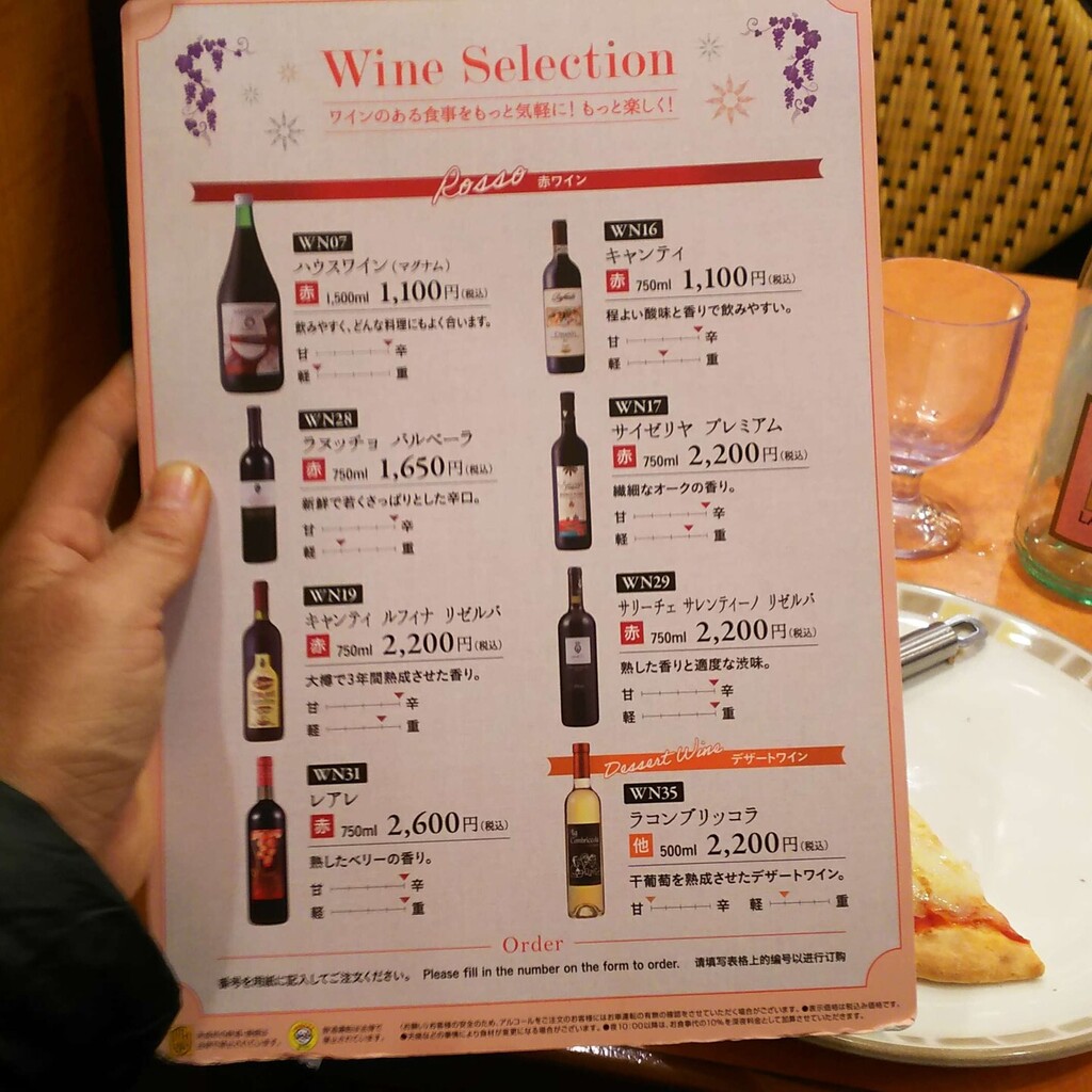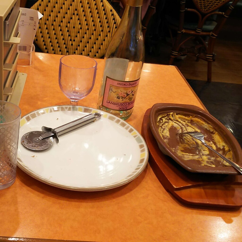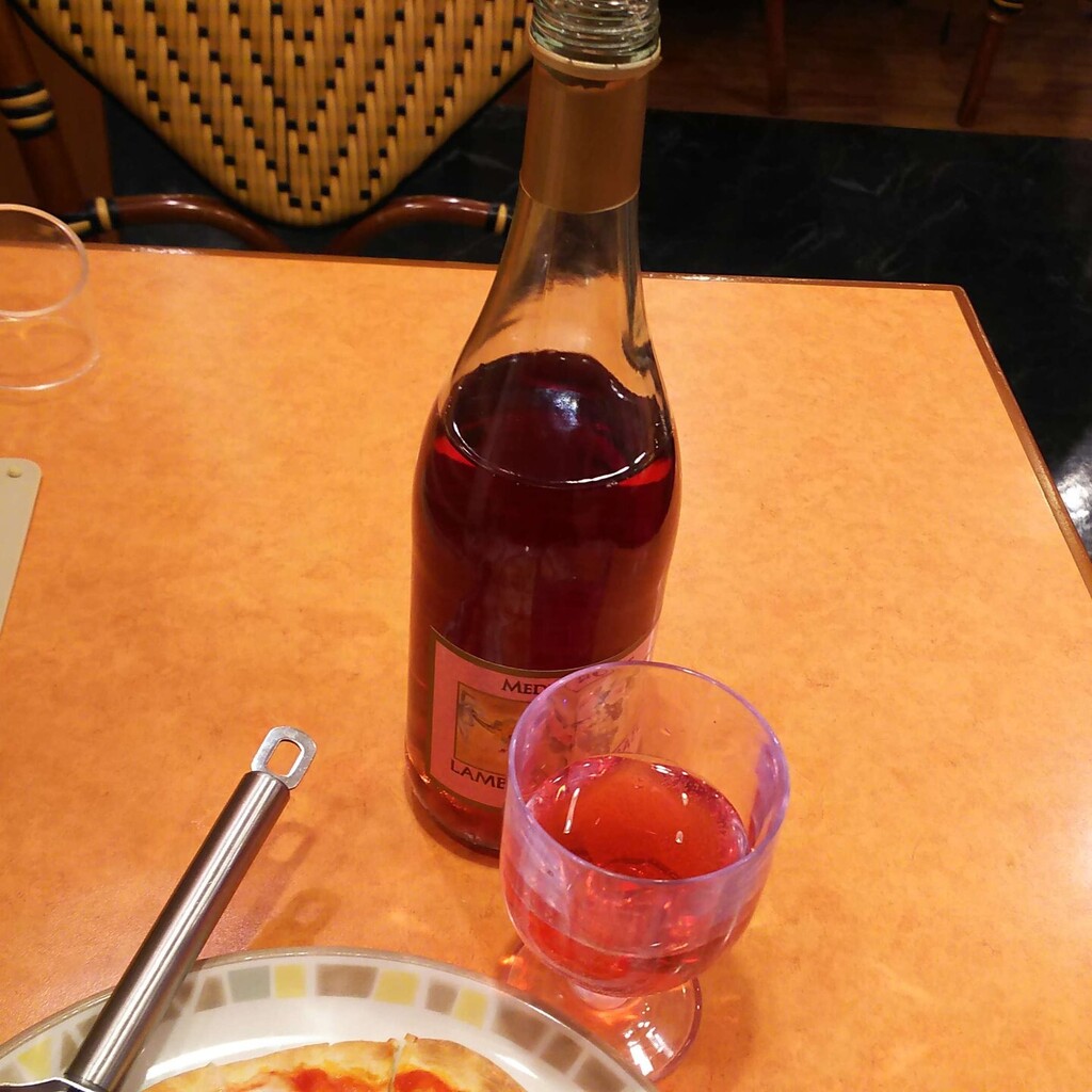 で、サイゼリヤで飲むなら、いつものデカンタではなくてボトルワインを頼むと決めていたので、昨年も 2度ほど注文しようとしたけれど品切れで飲めなかった、メニュー表を見て一番高いレアレを頼んだのですが、この日もなかったので、サイゼリヤプレミアムだとか何を頼むか悩みましたが、スパークリングワインのランブルスコルゼだったかな? 名前は覚えてないけれど、以前も飲んだことのある甘いワインを頼みました。