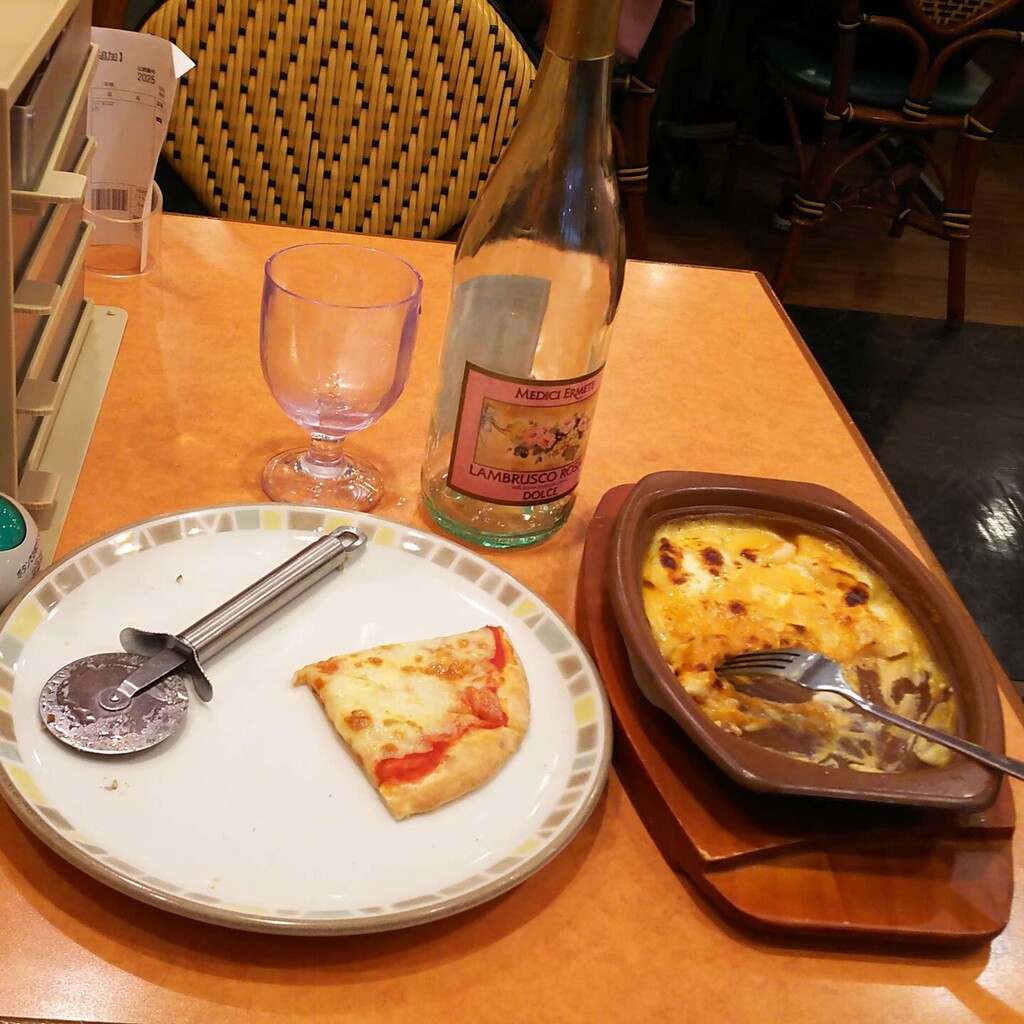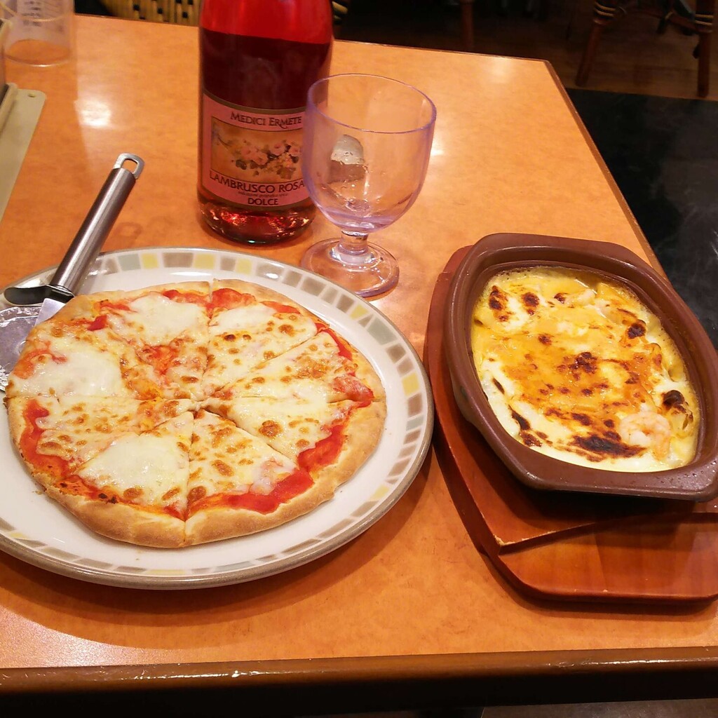 土曜日なのでランチメニューはないので、ピザとグラタンを頼みました。う~ん。平日ではないのでお酒を昼間から飲んでも背徳感みたいなものは薄かったですかね。ただ、やっぱり、もうちょっとしっかりしたワインを頼んでおけばよかったかな…と思いましたが…。