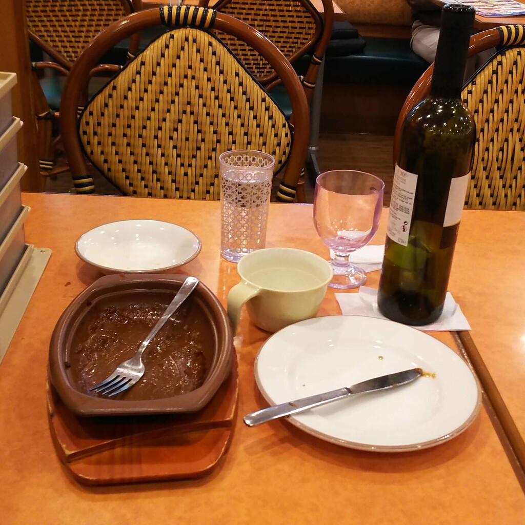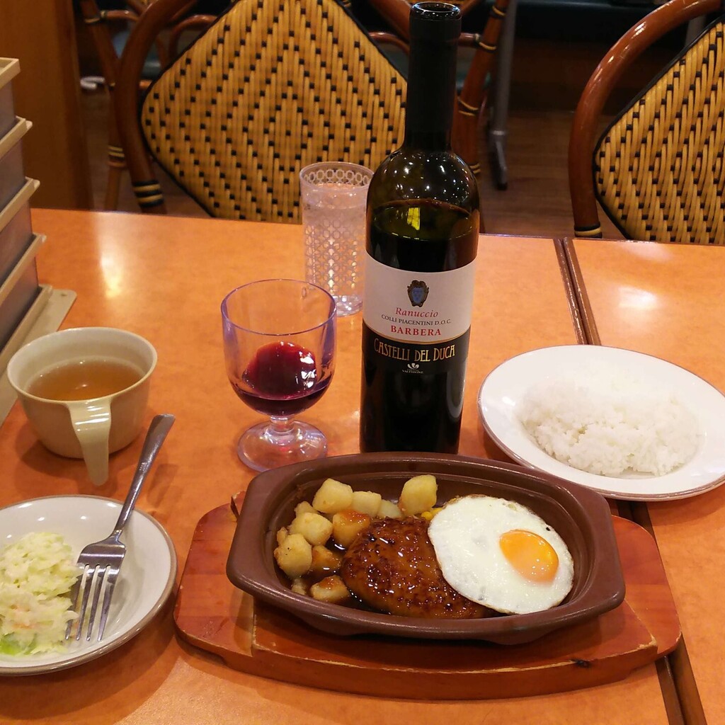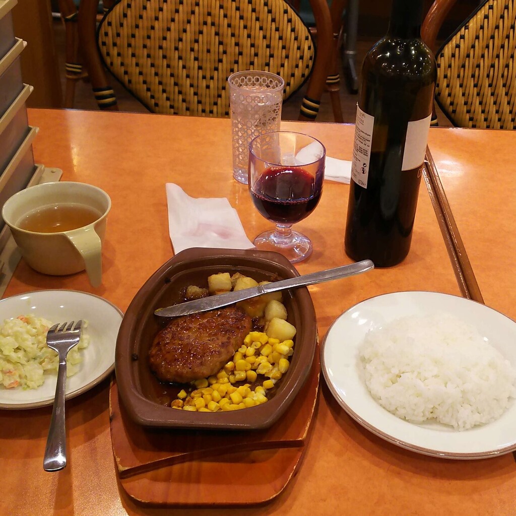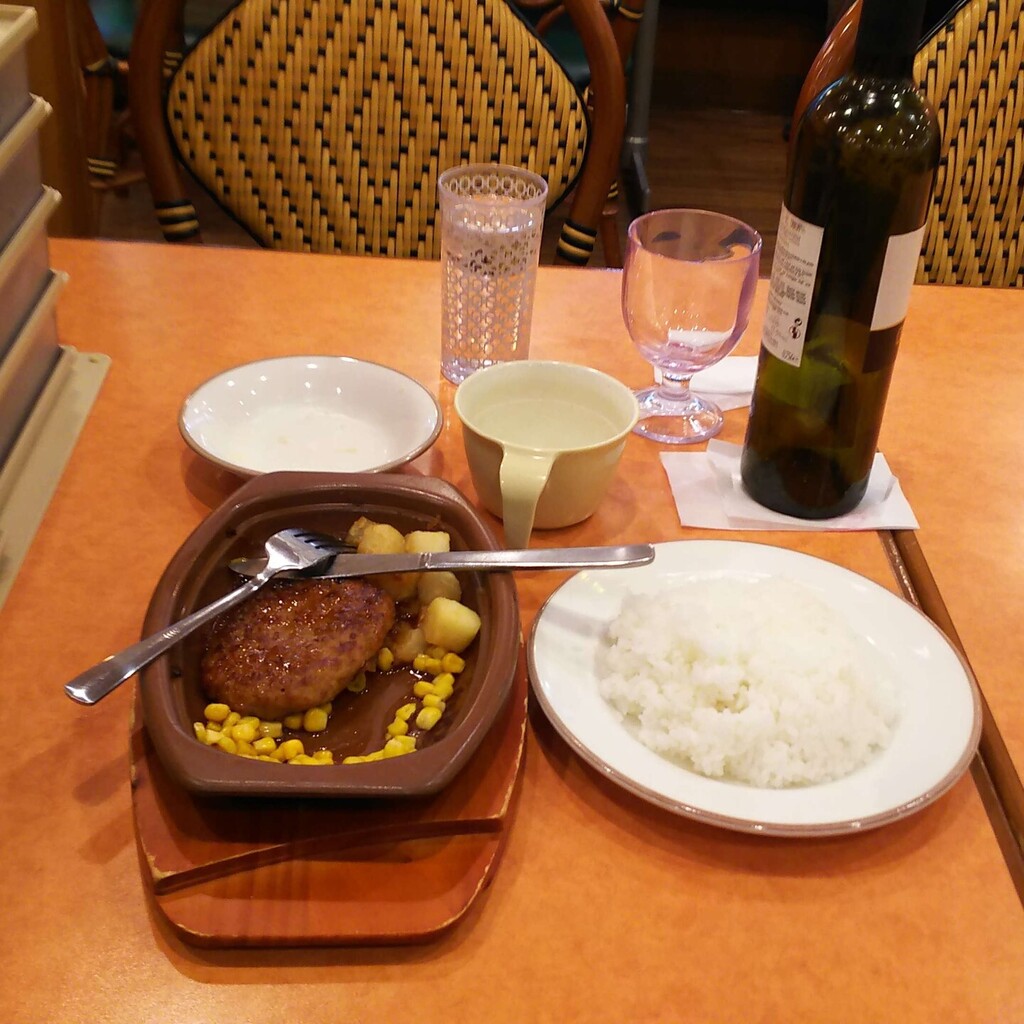 ワインを完飲しました。ここまでコールスローサラダと目玉焼きと添えてあるポテトとコーンを食べつつ、メーンであるハンバーグには手を付けていないのですね。